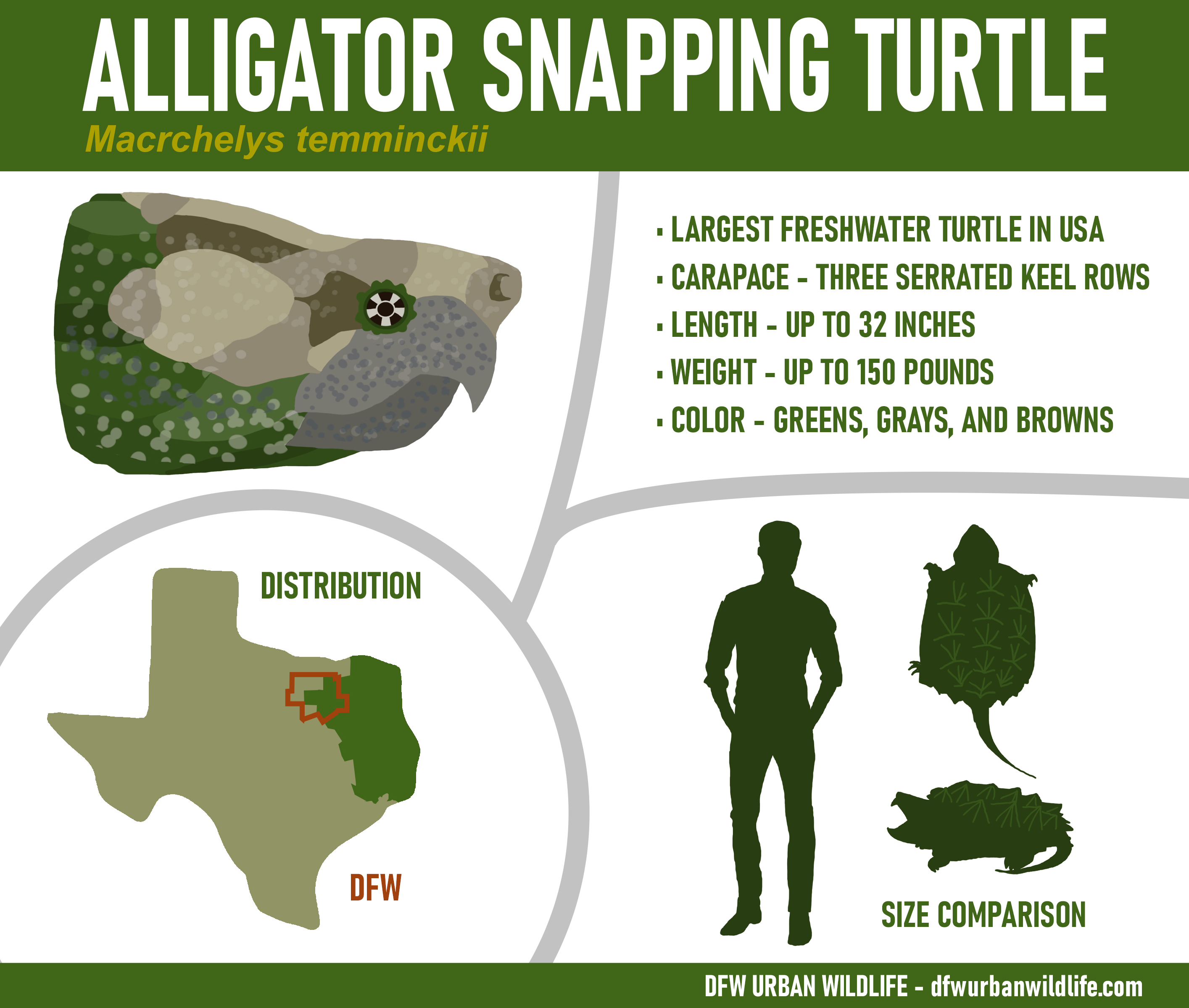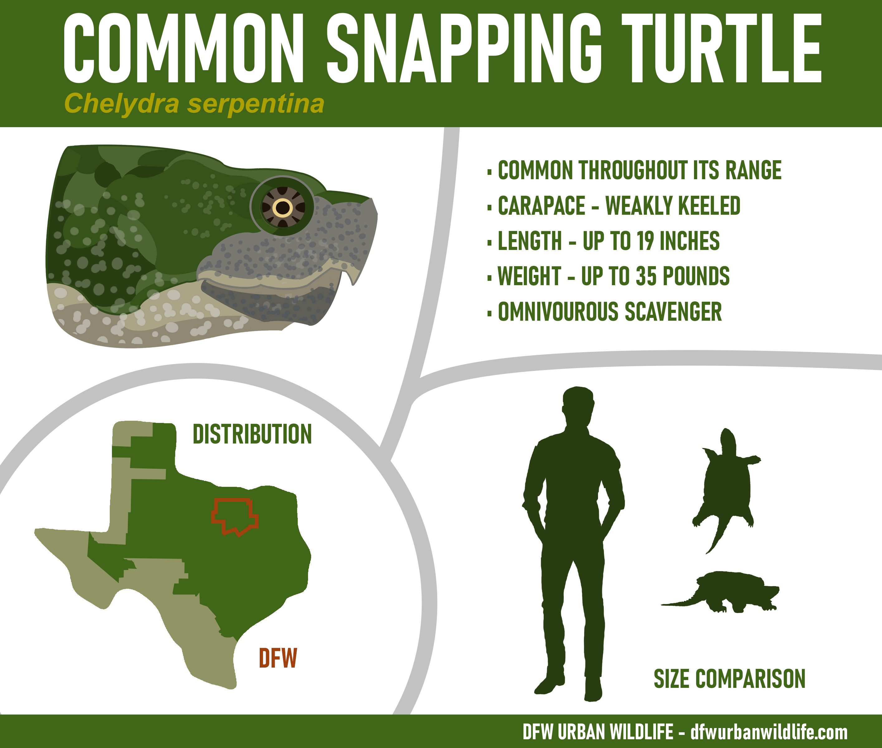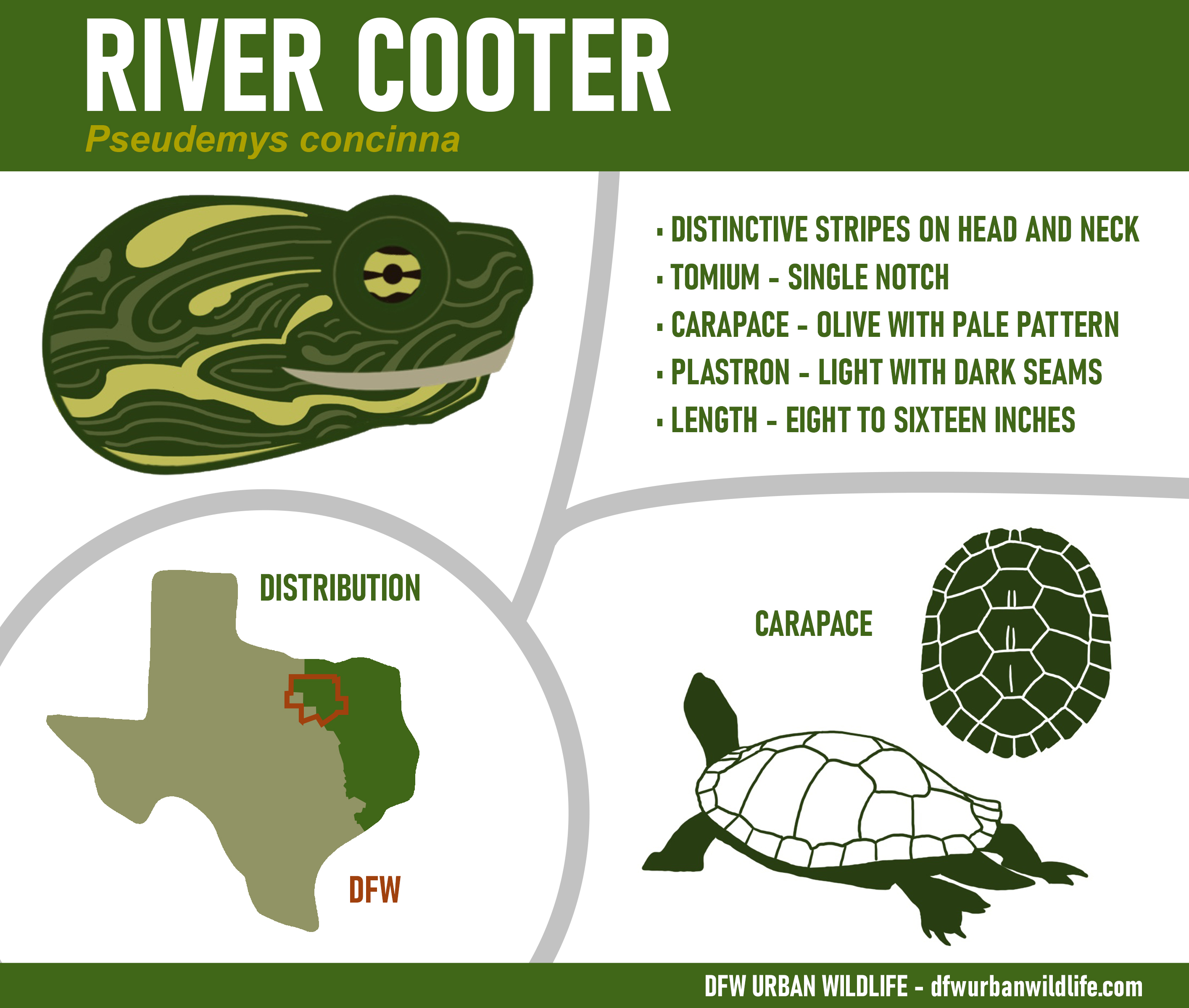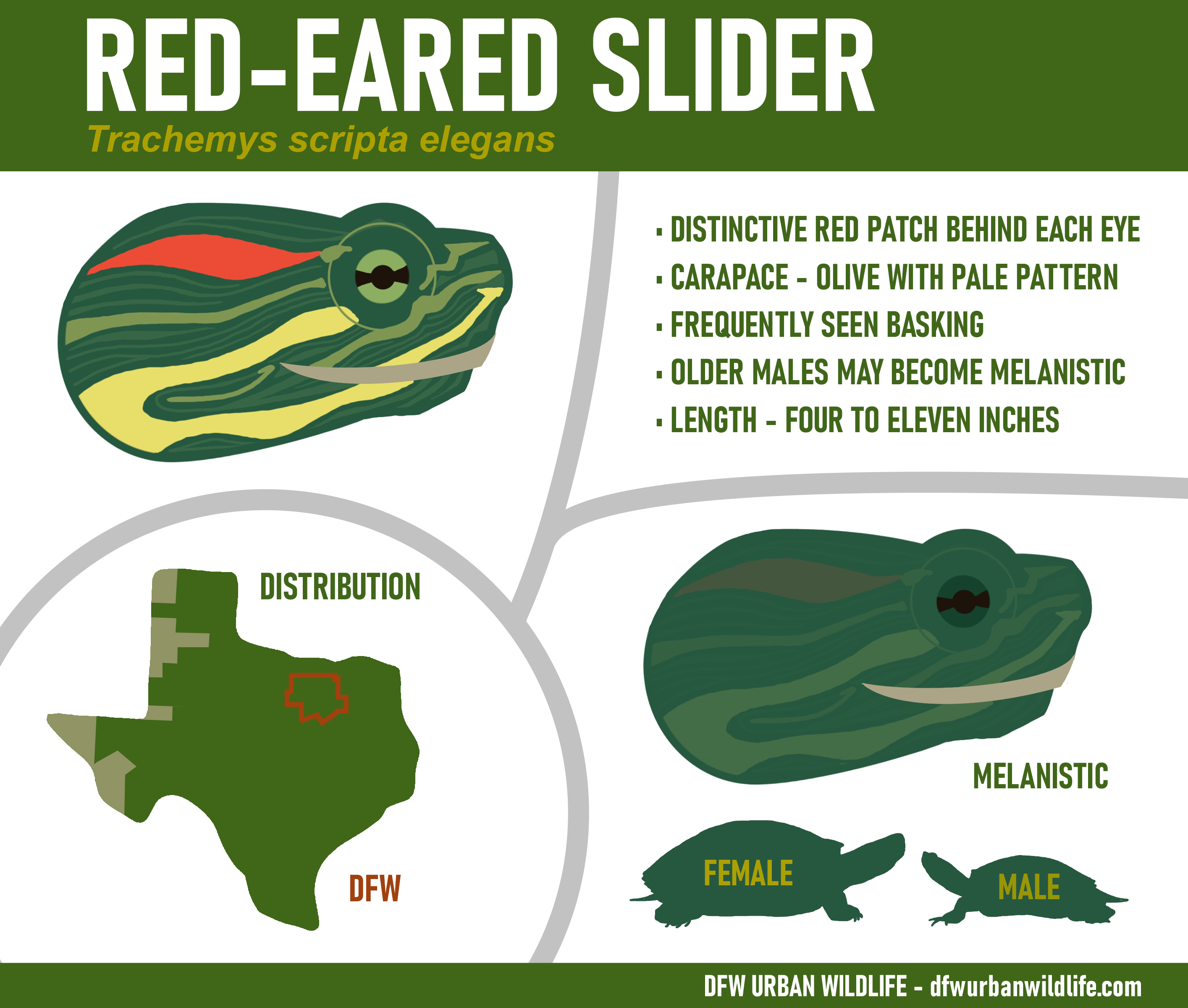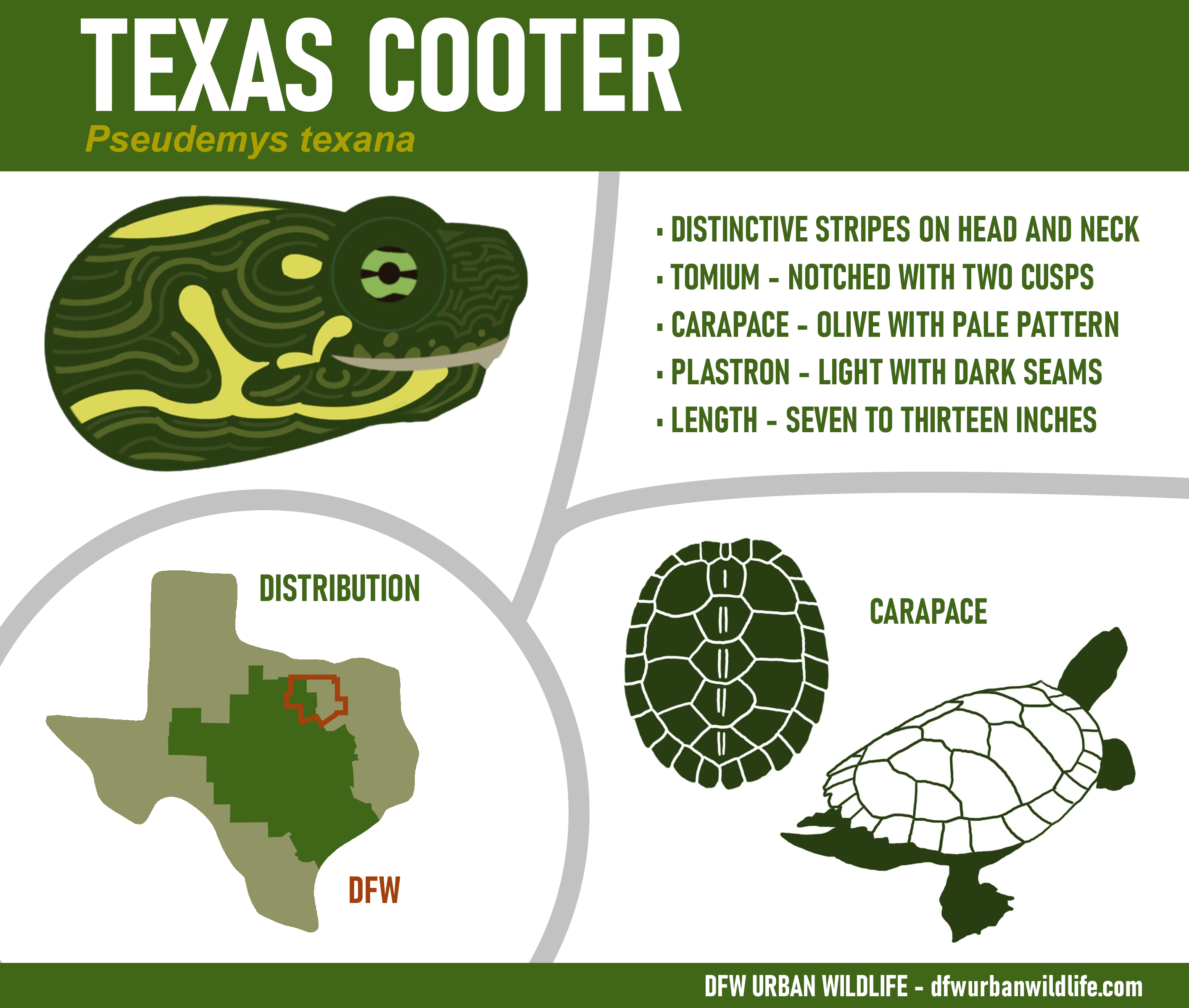 In this article, I have collected relevant information about the different turtle species found in the DFW area. For each entry, an infographic is provided describing important characteristics used to determine which turtle species has been observed. With a little luck, that will make identifications easier going forward.