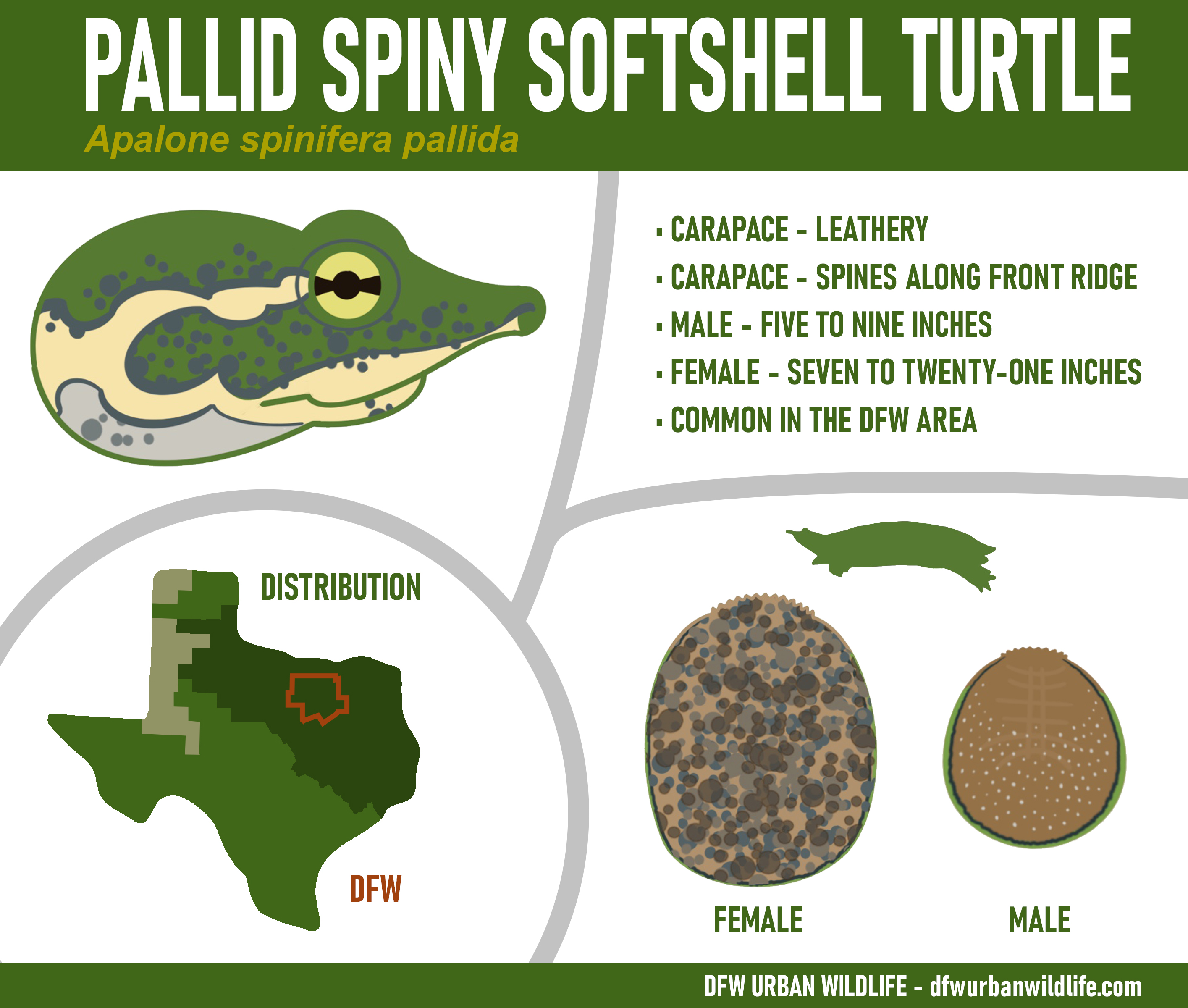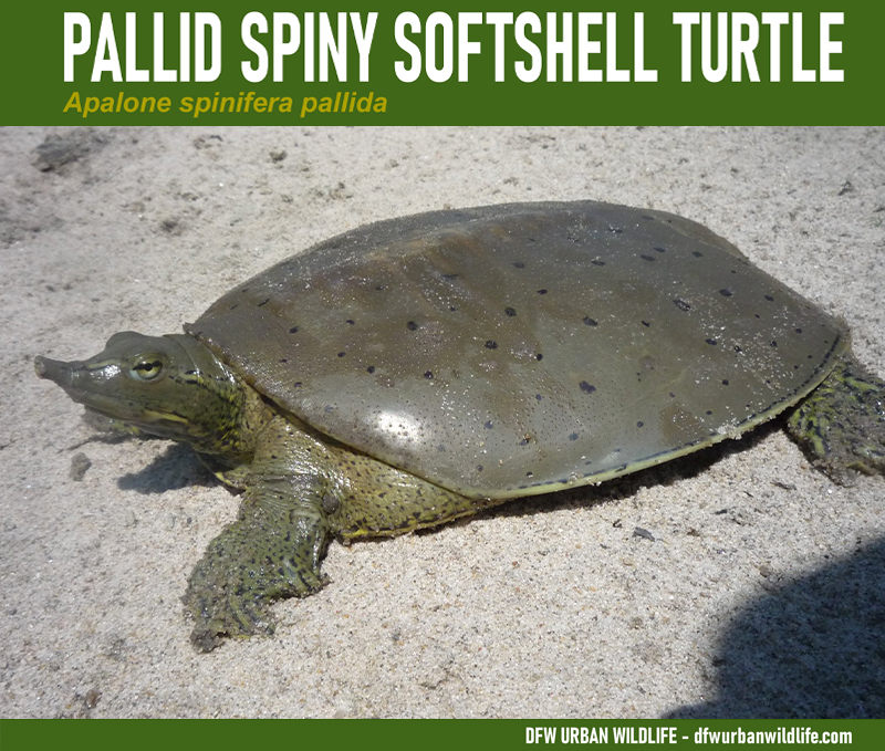 The Pallid Spiny Softshell Turtle is the subspecies that is present in and around North Texas. Two other subspecies of the the Spiny Softshell Turtle are present in Texas–the Texas Spiny and the Guadalupe Spiny. Both are native to areas far south and west of the Dallas/Fort Worth area.