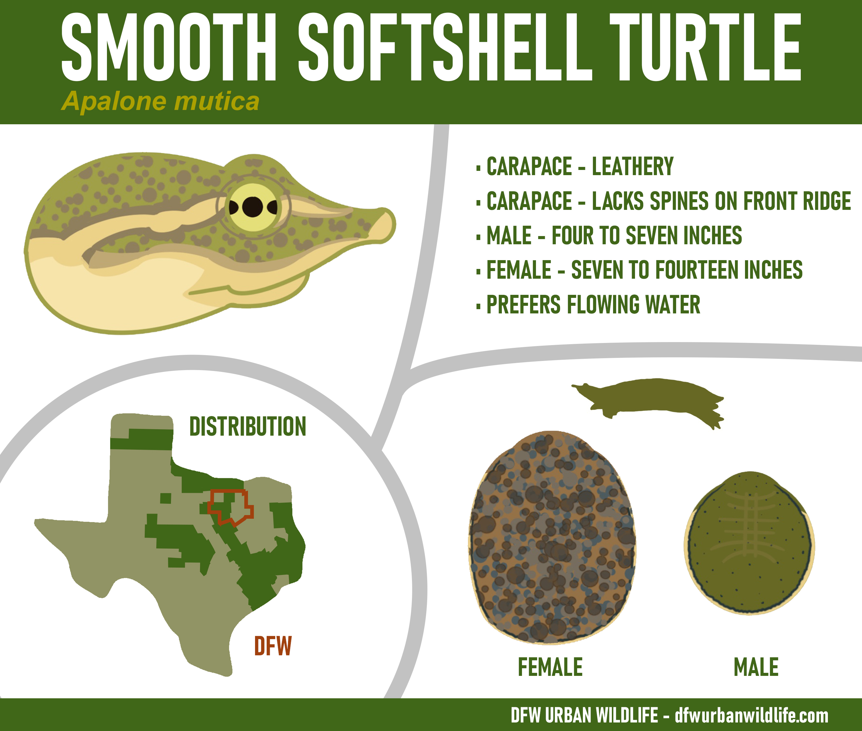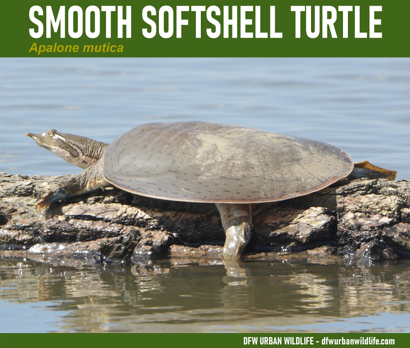 The Smooth Softshell Turtle is one of two species of softshell turtles found in the DFW metroplex. The Spiny Softshell Turtle is the other species, and both are superficially similar to each other in general appearance and behavior.