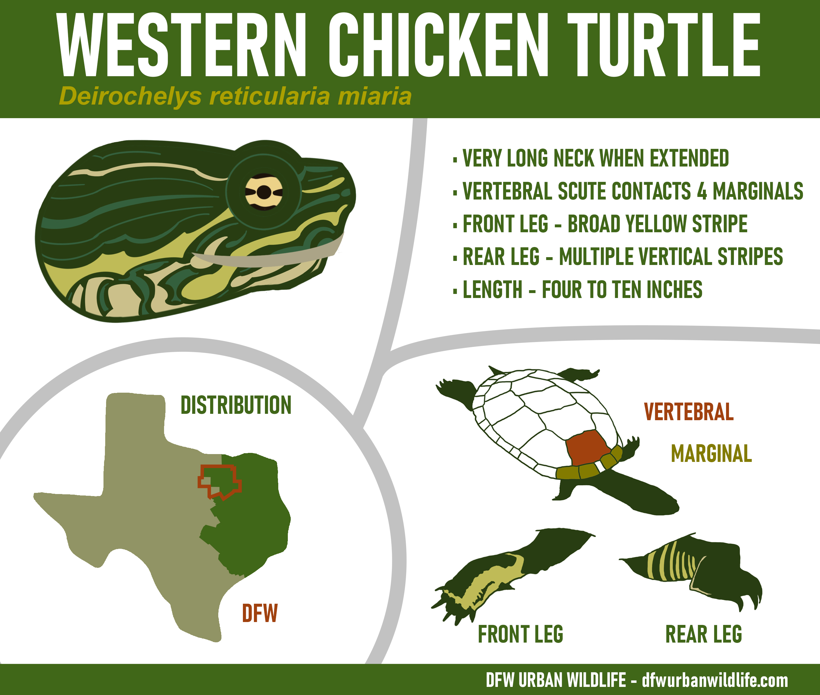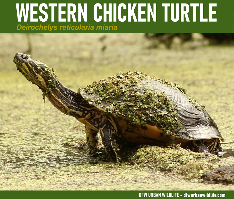 Western Chicken Turtles are not commonly encountered in Texas, and are rarely observed in the Dallas/Forth Worth area.