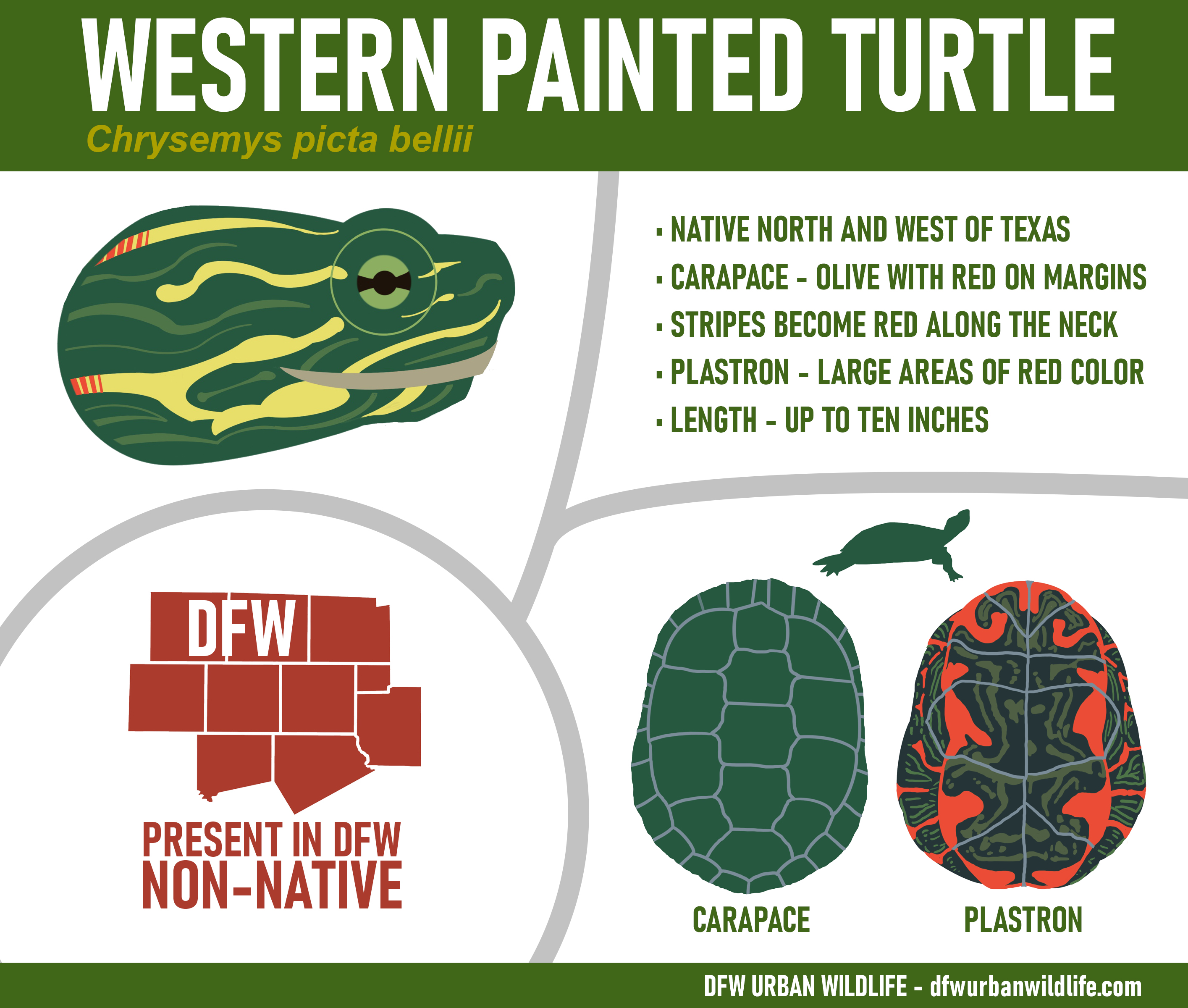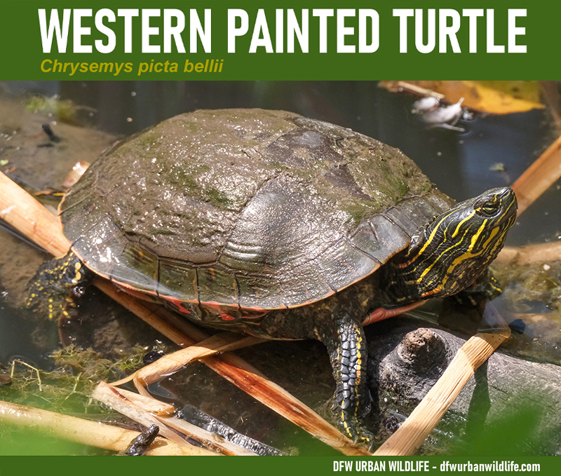 The Western Painted Turtle is not native to Texas or the Dallas/Fort Worth metroplex. Nonetheless this subspecies has been introduced into Texas–likely as released pets–and can now be found in many places across North Texas. The Western Painted Turtle is the the subspecies of Painted Turtle that is most commonly found in Dallas/Fort Worth.