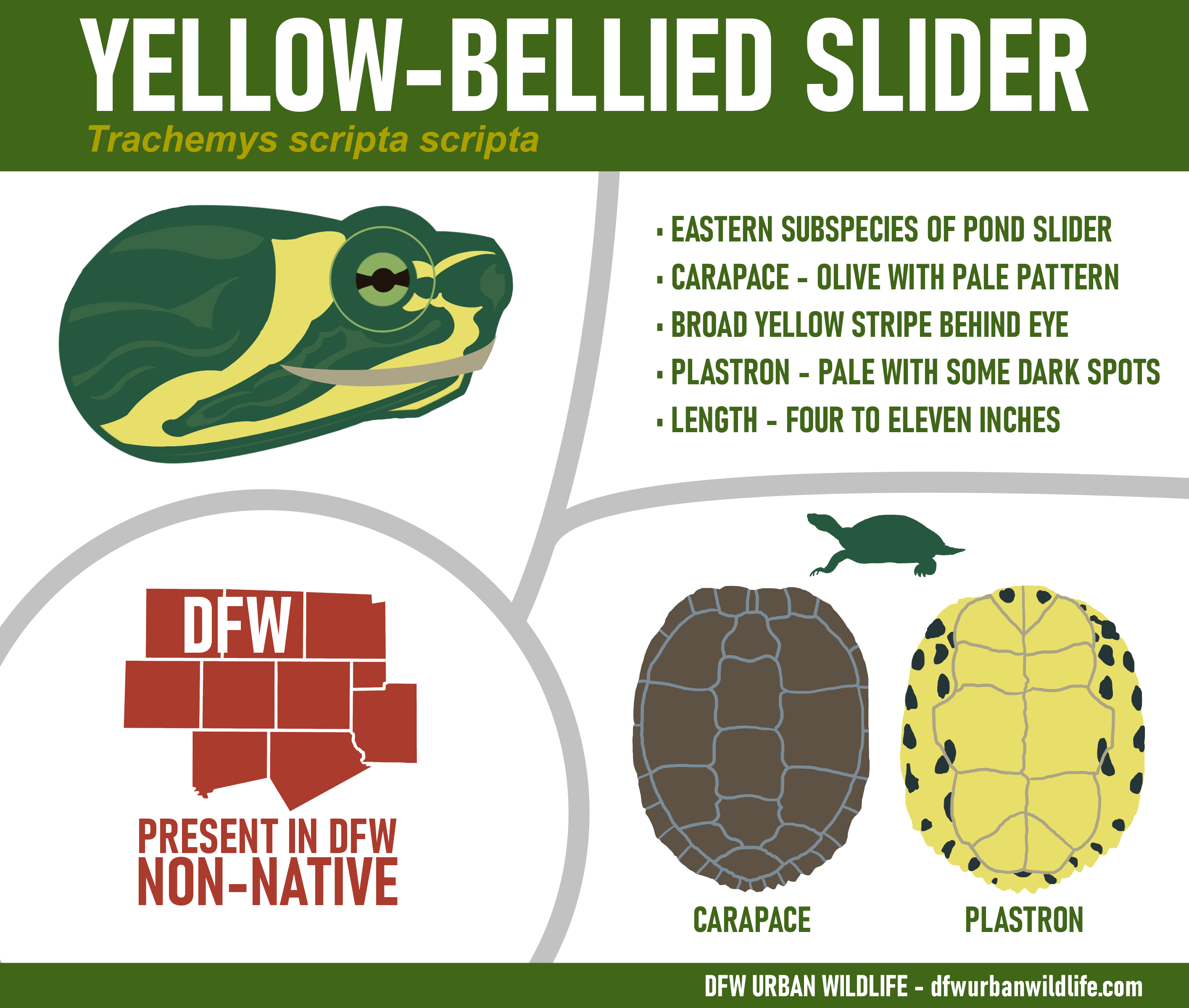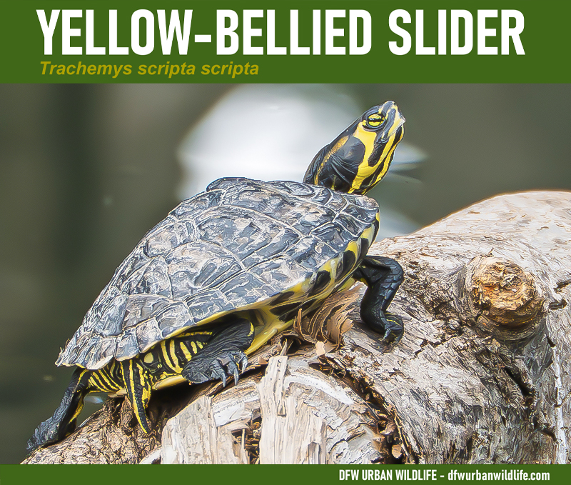 The Yellow-bellied Slider is not native to Texas or the Dallas/Fort Worth metroplex. The Yellow-bellied Slider is the the subspecies of Pond Slider that is native to southeast United States–Alabama, Georgia, parts of Florida and the Carolinas. Nonetheless this subspecies has been introduced into Texas–likely as released pets–and can now be found in many places across North Texas.