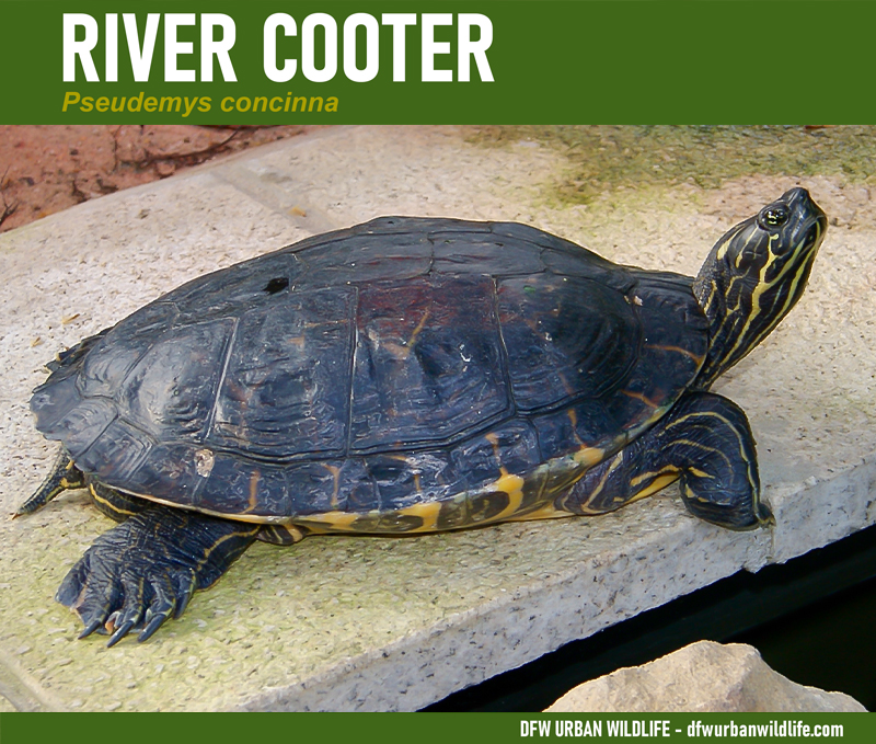 The River Cooter is a commonly seen basking turtle in the Dallas/Fort Worth area. The subspecies found in Texas is the Eastern River Cooter (Pseudemys concinna concinna).