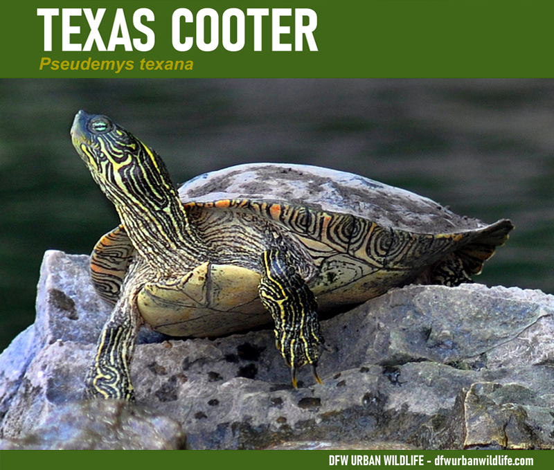 The Texas Cooter is a another relatively large basking turtle found in the Dallas/Fort Worth metroplex.