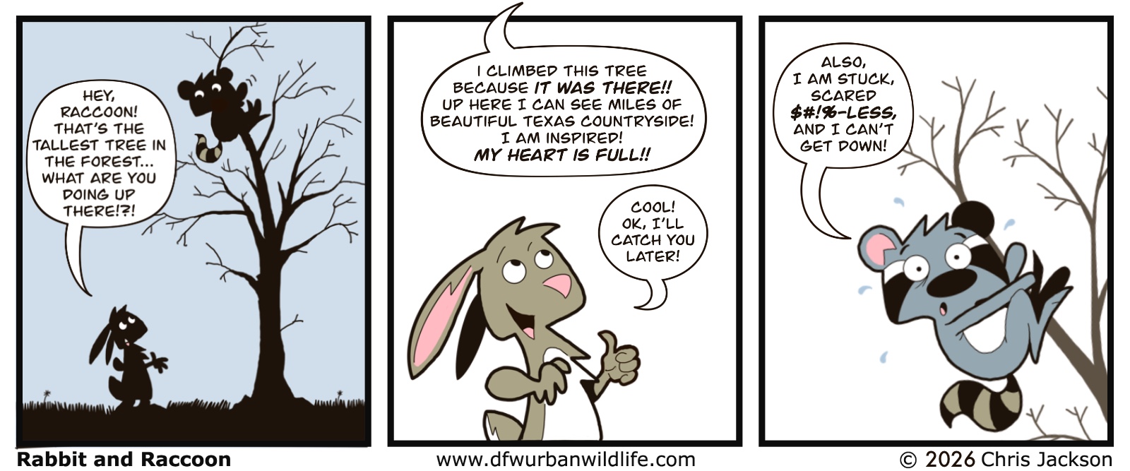 This edition of Rabbit and Raccoon can be considered a companion piece to our narrative about Skunks, Armadillos, and Opossums found in our recent article “Slow and Unaware.” The essay describes how these three animals survive and even thrive despite what at first appear to be some serious shortcomings. Opossums–in particular–seem to be seriously handicapped in the game of life, but it turns out nothing could be further from the truth. Although often thought of as slow moving and dim-witted, Opossums are nonetheless one of our most successful species. They must have something going for them!