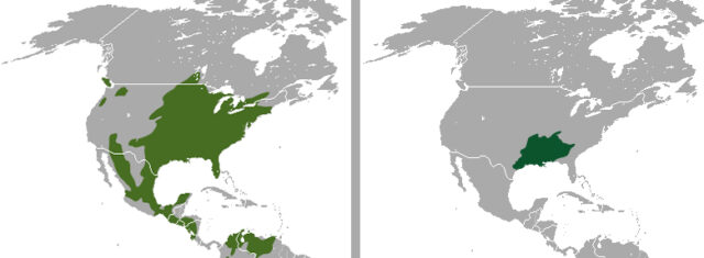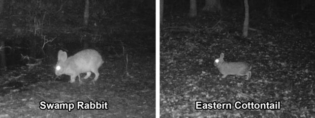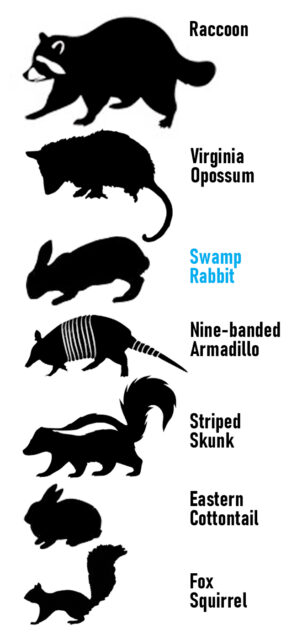 Swamp Rabbits are also decidedly larger than their dry-land cousins. Swamp Rabbits average around 21 inches in length, while the smaller Eastern Cottontail tops out around 16 inches. In terms of size and bulk, the Swamp Rabbit is closer to Opossums, Skunks, and Armadillos, while Eastern Cottontails are just a little larger than Fox Squirrels. If you ever happen flush a full grown Swamp Rabbit in the field, you will likely be struck by its unexpectedly large size.