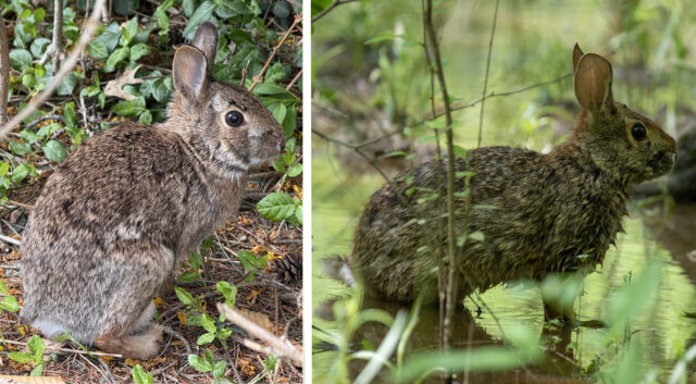 Recognizing the differences between the two species of cottontail rabbits in DFW can begin by noticing their behaviors. Swamp Rabbits are said to be semiaquatic, and they will navigate streams and rivers in a way that is not typical of any other rabbit species in Texas. Swamp Rabbits will readily take to water when fleeing predators–and sometimes even just for a swim. Eastern Cottontails, on the other hand, prefer drier locations, and are not particularly fond of water.