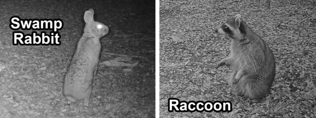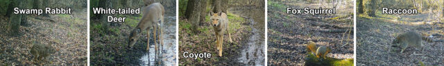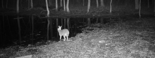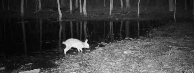 Other pictures showed rabbits that appeared to be entering or exiting vernal pools that formed in the forest during the wet season. Below, you will find a sequence of pictures showing cottontail rabbits accessing a large vernal pool on several different occasions. This behavior is suggests these are likely Swamp Rabbits, as Eastern Cottontails do not prefer the water. Eastern Cottontails rarely even come to water to drink, meeting most of their hydration needs via the moisture found in the vegetation they eat.